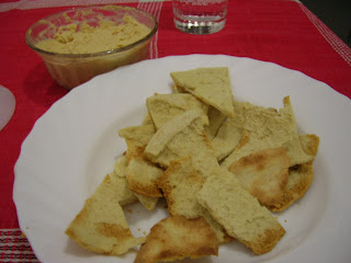 Blend all ingredients together (we used a hand-held blender), adding warm water as necessary until it looks like, well, hummus. I haven't ventured into bread-making yet, so we tore up and toasted pita bread for dipping since pita chips aren't an option here. I sprayed a little oil and spinkled salt on top before toasting them in a hot oven.